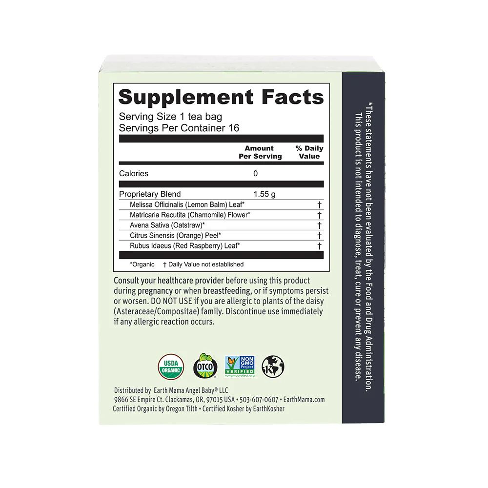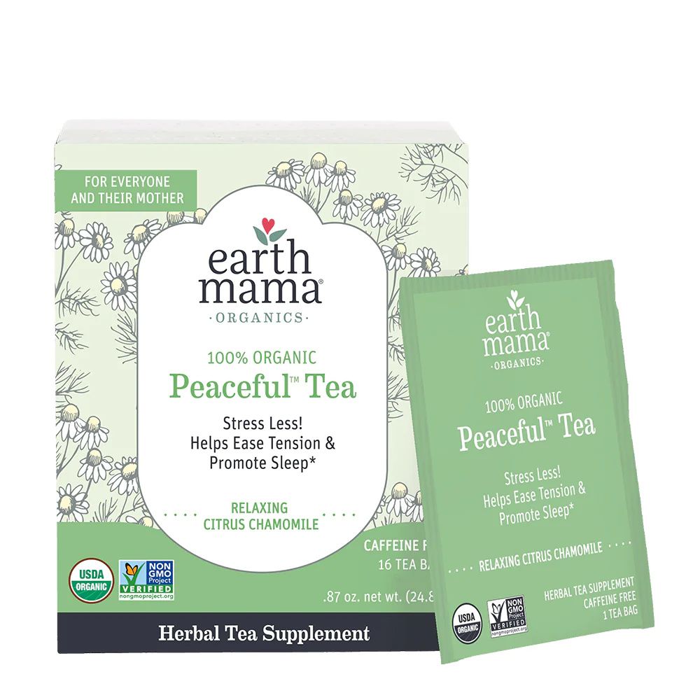 Earth Mama Organic Peaceful Tea is formulated with chamomile and herbs traditionally used to help promote a sense of calm, relieve occasional anxiousness, ease tension and promote sleep. With oat straw, calming chamomile, and a hint of red raspberry leaf and orange peel for a nice, bright citrusy vibe.